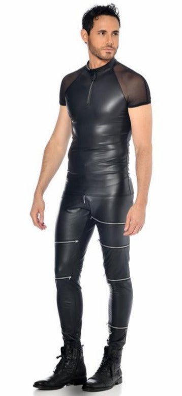 This T-shirt has a striking silver zipper in the neck and mesh sleeves. The black wet look is matte with a silky finish.